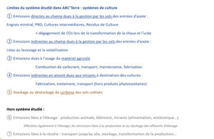 Comme pour tout type d’évaluation, il est primordial d’établir les limites du calcul, c’est-à-dire, déterminer ce qui est pris en compte dans l’évaluation. Le bilan de GES de la méthode ABC’Terre débute à l’entrée du champ (en intégrant les émissions en amont des intrants nécessaires pour cultiver) et s’arrête à la sortie du champ (la dernière étape considérée est celle de la récolte). Il se concentre sur les systèmes de cultures.