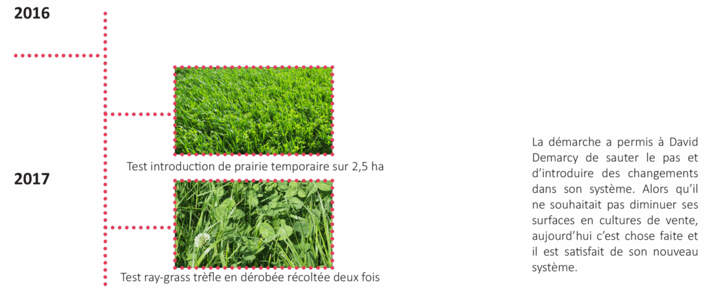 D’après David Demarcy, cette étape lui a permis de conforter ses réflexions personnelles et de sauter le pas pour mettre en place certains changements. Dont des changements impactant la surface en cultures de vente.