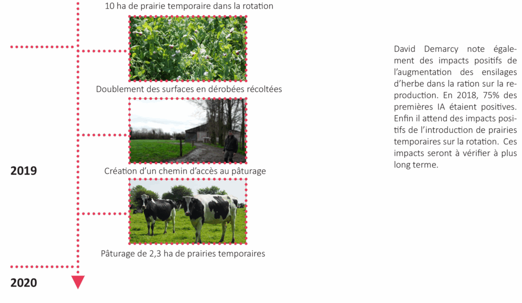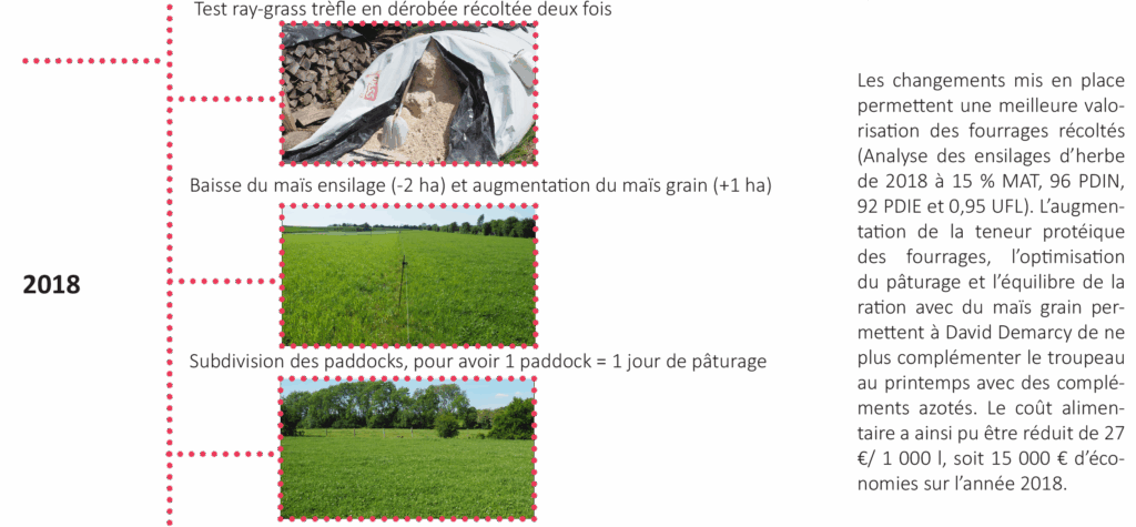 A l’issu de ce travail, David Demarcy retient les idées de : changer les espèces qu’il utilise pour ses dérobées, diminuer la part de maïs dans son assolement, réduire les achats de concentrés, augmenter la part des prairies mais en les insérant dans la rotation plutôt que d’augmenter la part de prairies permanentes.