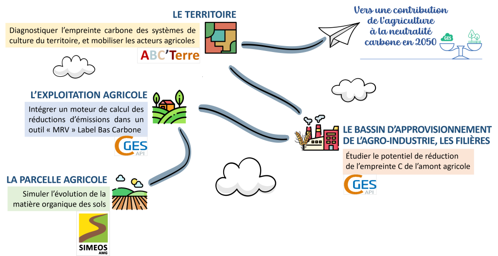 En 2020, une première innovation opérationnelle au service des territoires, ABC’Terre, a permis de créer un outil capable d’évaluer le bilan GES d’un système de culture incluant la variation du stock de carbone des sols calculée via SIMEOS-AMG (pour en savoir plus sur la genèse de SIMEOS-AMG). L’expertise ainsi développée a été sollicitée pour l’élaboration de la méthode Label bas Carbone Grandes Cultures sortie en 2021. Une nouvelle API de calcul, C-GES, basée sur la méthode Label Bas Carbone et réalisant le bilan GES des systèmes de cultures de l’exploitation, couplé au bilan Carbone des sols est également disponible depuis 2023. Ces outils doivent aider à la construction de plans d’atténuation carbone réellement efficaces, de la parcelle au territoire, en passant par les filières.