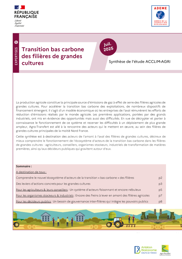 En 2024, l’étude ACCLIM-AGRI, soutenue par l’ADEME, a permis d’identifier les freins et leviers à une transition bas carbone accélérée des filières de grandes cultures :