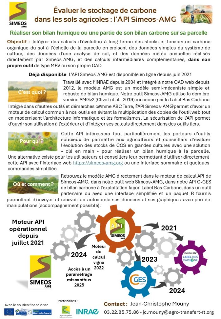 Le modèle de bilan humique AMG est un modèle semi-mécaniste à trois compartiments simple et robuste de simulation de l’évolution des stocks de carbone organique du sol (COS). Le COS est divisé en deux pools dont un considéré stable à l’échelle du siècle. Les flux d’entrée de carbone dans le pool de COS considéré actif à moyen-long terme qui sont issus des résidus de culture sont obtenus à partir du rendement et de coefficients d’allométrie. Les flux de sortie de carbone du pool actif du COS sont essentiellement fonction du pédoclimat. Publié pour la première fois en 1999 (Andriulo, et al., 1999), il a été mis à jour suite au projet GCEOS (Saffy Hdadi & Mary, 2008) puis au projet Solébiom (Clivot, et al., 2019) dans sa version AMGv2 et a fait l’objet de nombreuses évaluations ou inter-comparaisons de modèles (Farina, et al., 2020) et améliorations (Levavasseur et al., 2021 ; Kanari, et al., 2022). Il est maintenu, amélioré, vérifié et certifié dans le cadre du Consortium AMG (Agro-Transfert, INRAE, Arvalis, URCA et LDAR, à venir : Cirad, IFV et Terre Inovia).