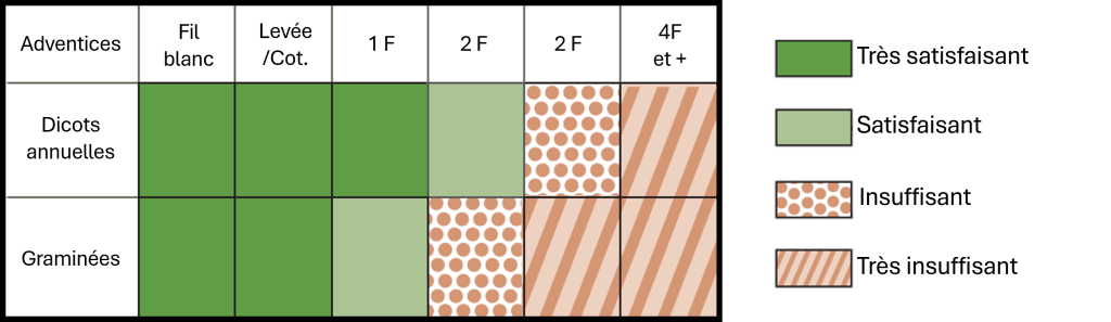 La houe rotative est peu efficace au-delà du stade cotylédons, mais on peut noter quelques différences entre les espèces :