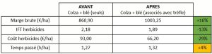 IFT et coût herbicides : La baisse des herbicides s’explique par un programme allégé sur le blé suivant le colza (réduction de dose) grâce à la moindre de pression en adventice (concurrencée par le couvert de trèfle)