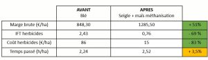 Marge brute : La marge brute du blé est augmentée grâce à la réduction des herbicides. Le tournesol présente une meilleure marge à l’hectare, à l’inverse du pois protéagineux. La marge brute hectare de l’assolement est ainsi en moyenne inchangée.